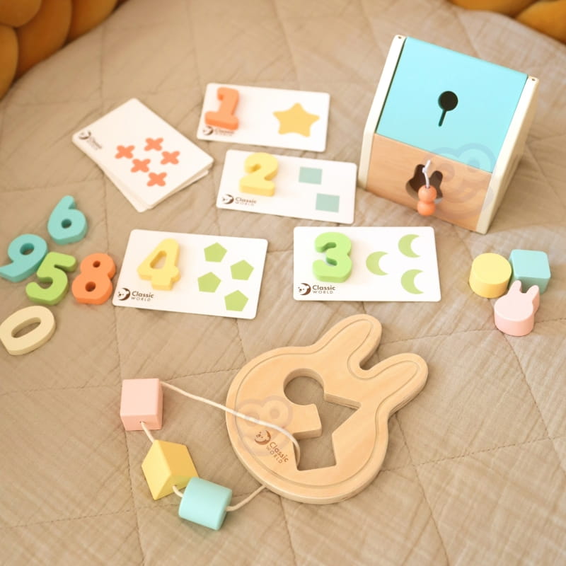 Pastelowy Zestaw Classic World to starannie dobrany pakiet drewnianych i bezpiecznych zabawek, zaprojektowany z myślą o dzieciach od 12 do 18 miesięcy, który łączy w sobie elementy sorterów, układanek do nauki liczenia, klocków literniczych oraz angażującej przewlekanki w kształcie królika; zestaw uczula maluchy na kształty, kolory i cyfry, wspomagając ich małą motorykę, koncentrację i eksplorację sensoryczną, a wszystkie elementy wykonane są w delikatnych pastelowych kolorach z gładkimi krawędziami – idealny na prezent wspierający wszechstronny rozwój.