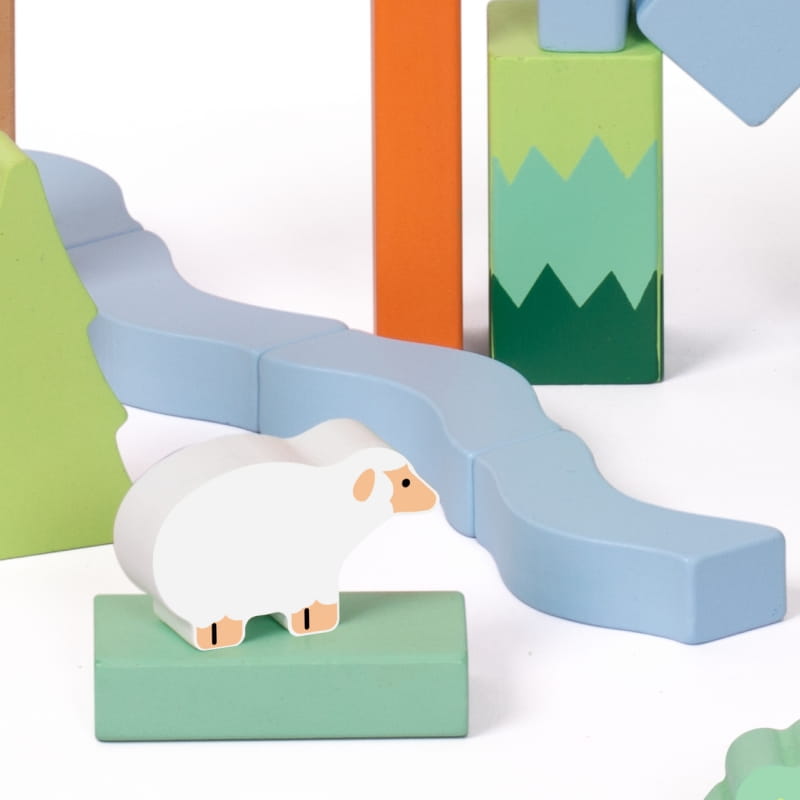 W skład zestawu wchodzą różnorodne klocki o różnych kształtach i rozmiarach, a także figurki zwierząt i roślin – wszystko z wysokiej jakości drewna, bezpieczne i trwałe. Z klocków można budować domki, mosty, zwierzęce siedliska i wiele innych.