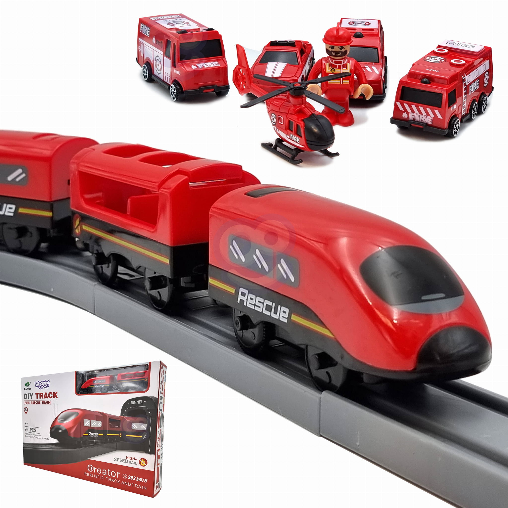 Ten rozbudowany zestaw to marzenie każdego małego maszynisty – lokomotywa zasilana dwoma bateriami AAA, wagoniki, komplet torów (w tym most i tunel), remiza, auta strażackie, helikopter, znaki i figurki strażaków. Całość zapakowana w kolorowe, oryginalne pudełko – gotowa na prezent