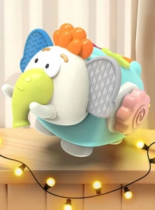 Kolorowy i przyjazny wygląd słonia, z pewnością przyciągnie uwagę maluchów. Nagrzbiecie umieszczono kilka kolorowych przycisków do klikania, co dostarcza dziecku wrażeń dotykowych i rozwija zdolności manualne. Na bokach zabawki znajdziemy- terkoczący kwiatek, który obraca się i wydaje delikatne dźwięki, angażując dziecko w zabawę. Jak i kółeczko wypełnione grzechoczącymi koralikami, które można obracać, stymulując słuch i koordynację ręka-oko.