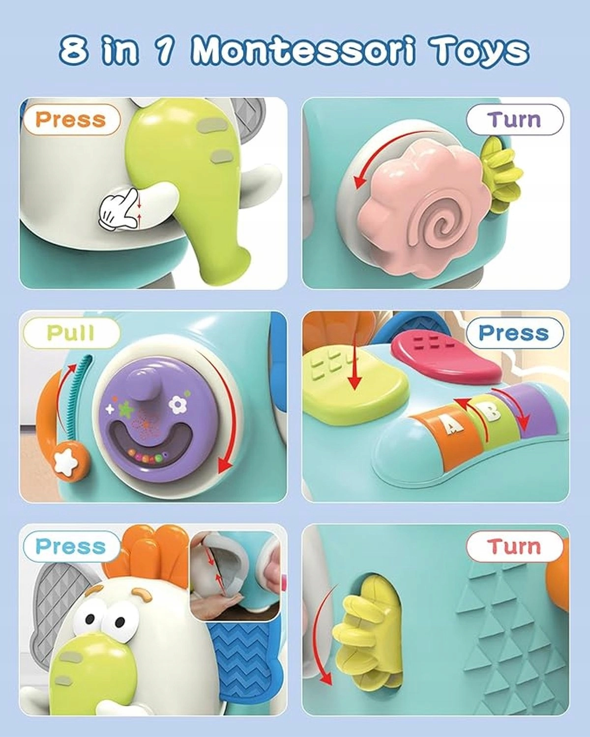 Rewelacyjna zabawka edukacyjna dla Twojego dziecka.Każda ze stron słonika zapewnia maluszkowi wiele atrakcji i niespodzianek, absorbując jego uwagę na długi czas.Zabawka stymuluje wszystkie zmysły dziecka oraz wspiera jego rozwój. Intensywne kolory, przyjemne dźwięki zachęcają dziecko do zabawy.