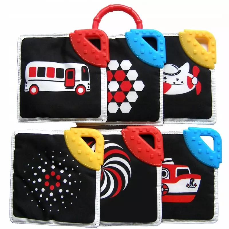 Miękka, kontrastowa książeczka sensoryczna z gryzakami i ilustracjami pojazdów — idealna dla maluszków od pierwszych dni życia, stymuluje zmysły, wspomaga ząbkowanie i rozwój wzroku.