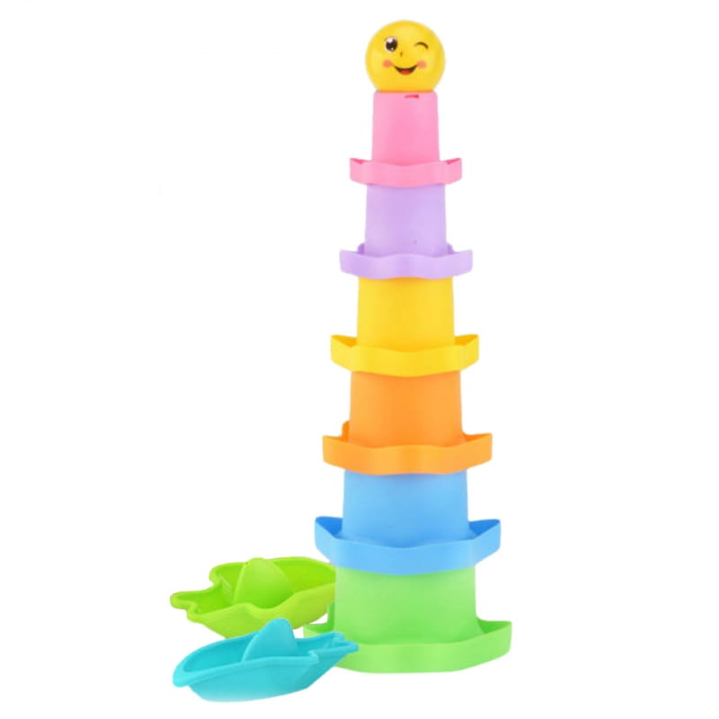 Kolorowa piramidka z kubeczków i piłeczką, stworzona do zabawy sensorycznej i rozwijania motoryki malucha.