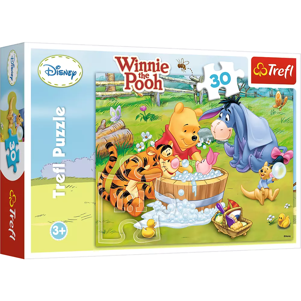 „Puzzle 30 elementów – Kąpiel Prosiaczka” to urocza układanka z bohaterami Kubusia Puchatka. Idealna dla najmłodszych — rozwija spostrzegawczość i sprawia mnóstwo radości z pierwszych puzzlowych przygód.