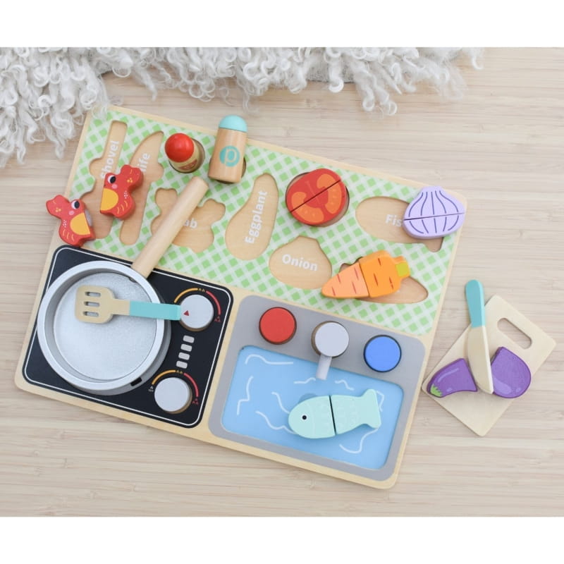 - Wygodna plansza, dzięki której dziecko poznaje nazwy warzyw, sztućców kuchennych i innych przedmiotów związanych z gotowaniem i jedzeniem