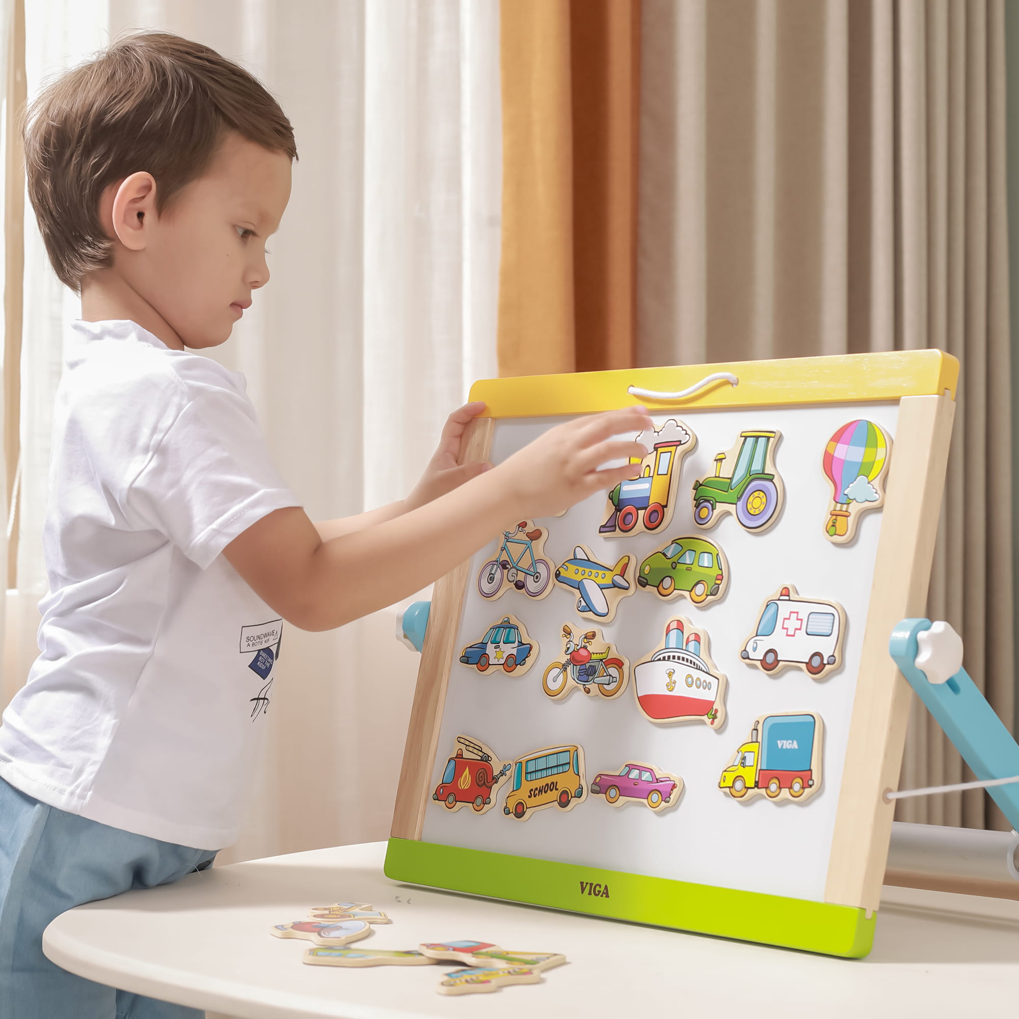 Kolorowy zestaw VIGA Drewniane magnesy – pojazdy (20 el.) – bajecznie kolorowe magnesy w kształcie aut, samolotów czy łodzi. Idealne do przyczepienia na tablicę lub lodówkę – rozwijają wyobraźnię i koordynację. Wygodnie zapakowane!