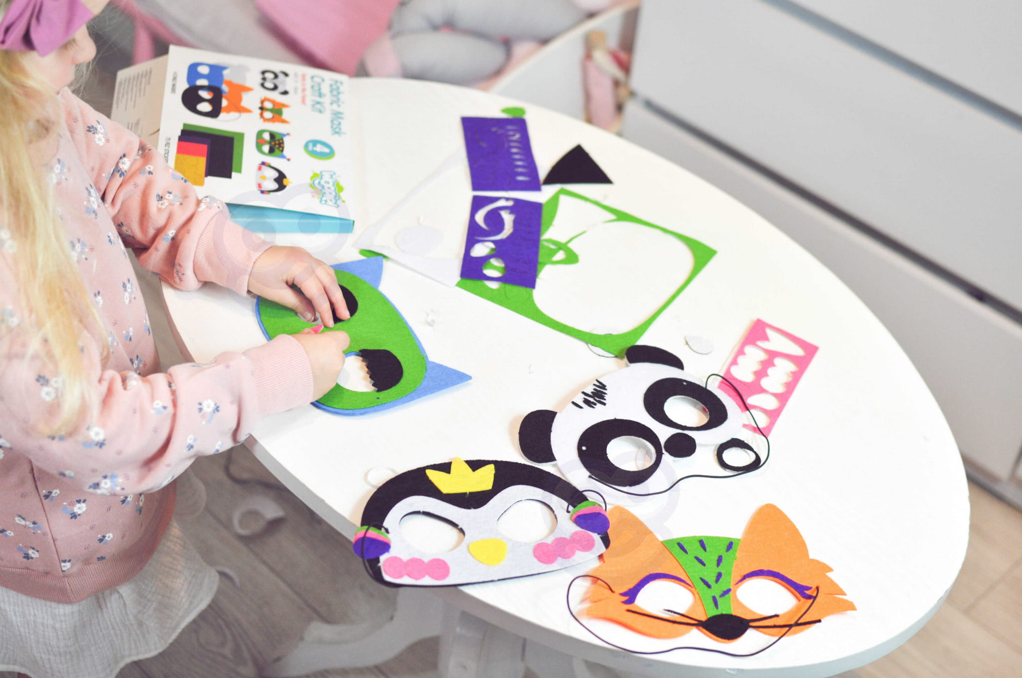 Dziecko może indywidualnie dopasować maskę, korzystając z samoprzylepnych elementów, rozwijając kreatywność, wyobraźnię i motorykę małą. Po skończeniu – idealny materiał do zabaw w przebieranki, teatrzyki czy przyjęcia urodzinowego! Idealne do zabawy solo lub w gronie znajomych.