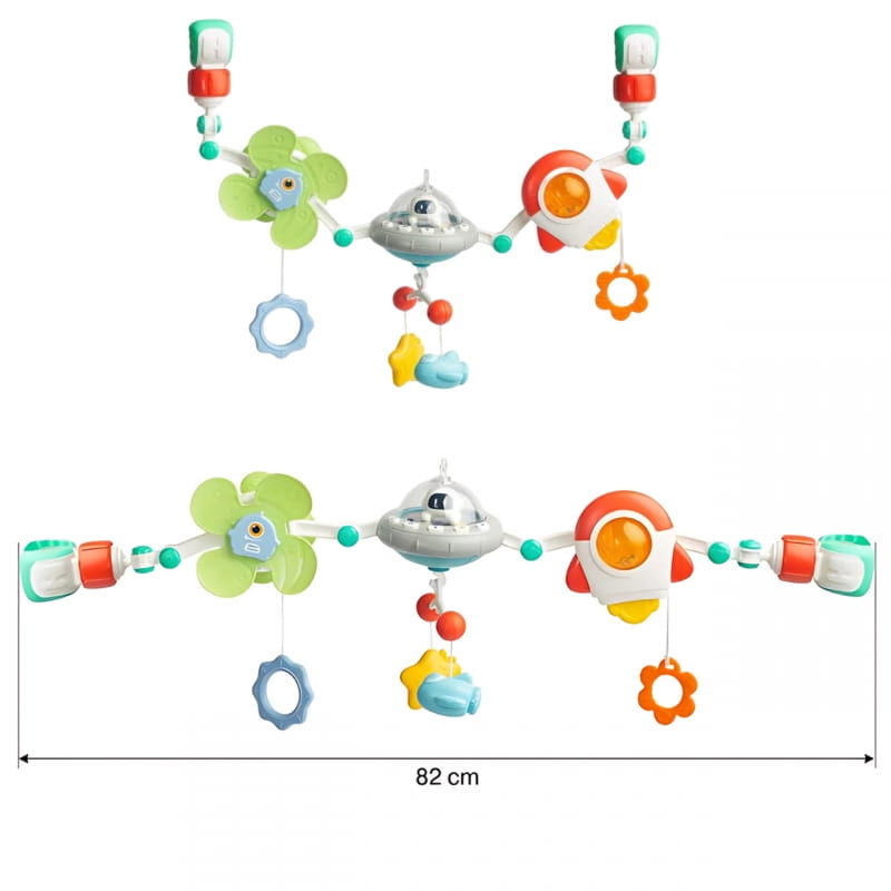 Zabawka WOOPIE BABY Interaktywny Pałąk Łuk do Łóżeczka to elastyczny, łatwy w montażu pałąk, wyposażony w trzy stałe elementy i zawieszoną karuzelkę z zabawkami reagującymi na dotyk (wiatraczek, grzechotka, materiacze gryzaki); płynące kołysanki i delikatne, zmieniające kolor migające światła tworzą uspokajającą atmosferę, natomiast różnorodne faktury i kształty stymulują zmysł dotyku oraz zachęcają do ruchów rękami i nogami – idealna zabawka rozwijająca motorykę małą, percepcję sensoryczną i rozumienie przyczynowo-skutkowe już od pierwszych dni życia.