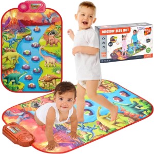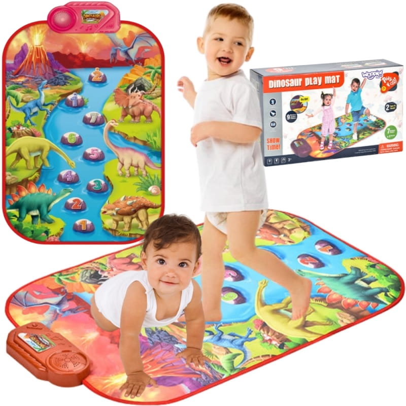 Duża, interaktywna mata muzyczna WOOPIE z motywem dinozaurów łączy funkcje pianina i perkusji, z 8 instrumentami do wyboru, nagrywaniem utworów i regulacją głośności — idealna do tańca i zabawy od 1 roku życia, rozwijająca motorykę, słuch i kreatywność.