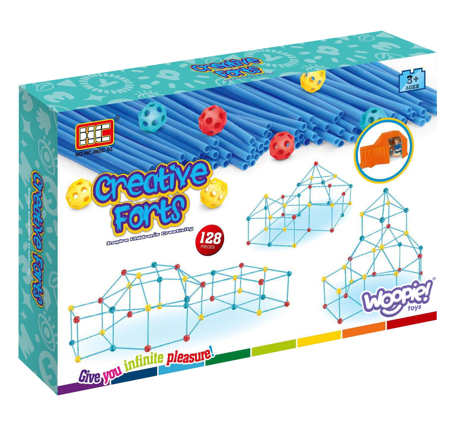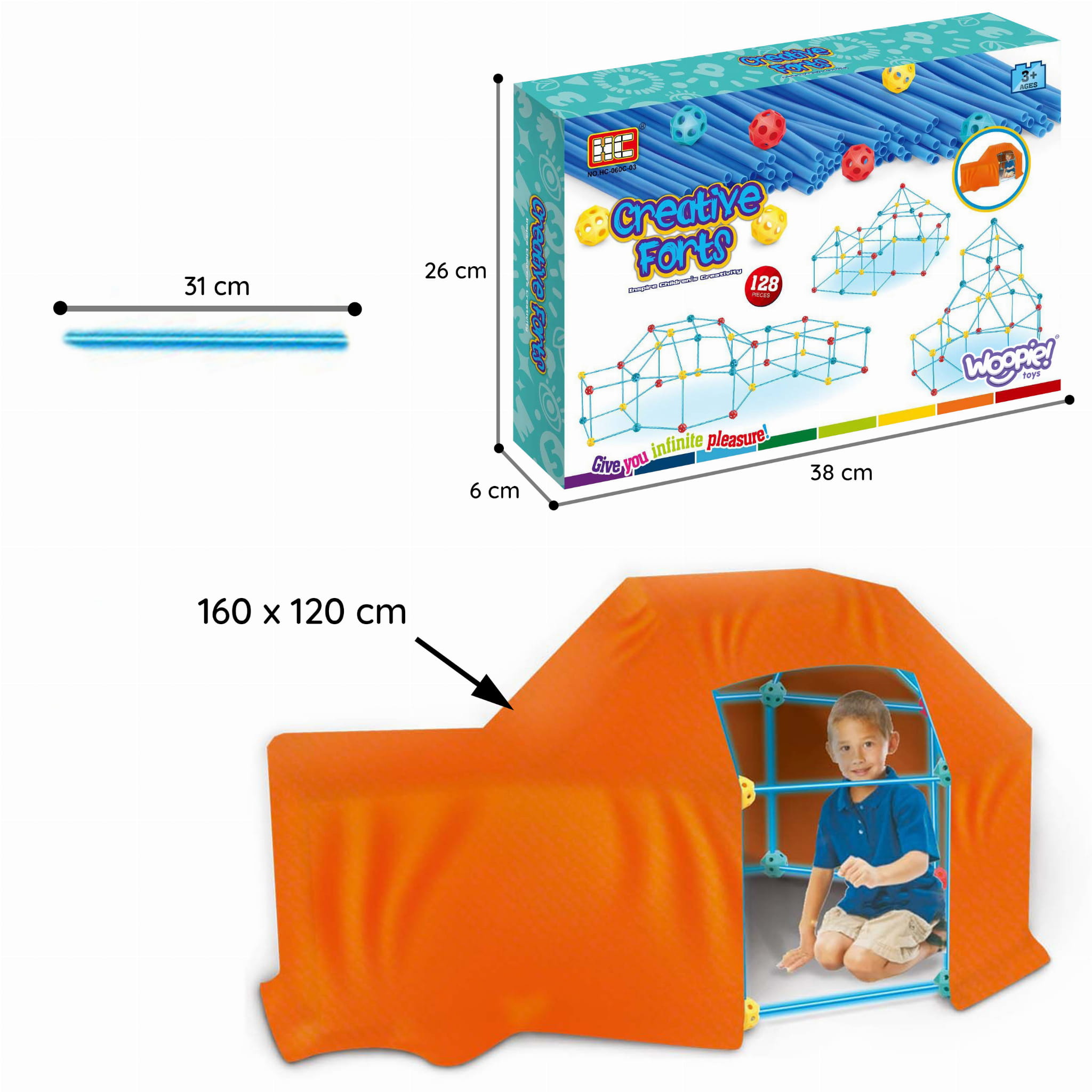 Zestaw WOOPIE Duże Klocki Konstrukcyjne 128 el. to kolorowe rury (słomki) o długości 31 cm, łączniki i materiał o wymiarach 160 × 120 cm, pozwalające zbudować namiot, fort lub bazę. Dla dzieci od 3 lat, idealny do zabawy w domu i ogrodzie.