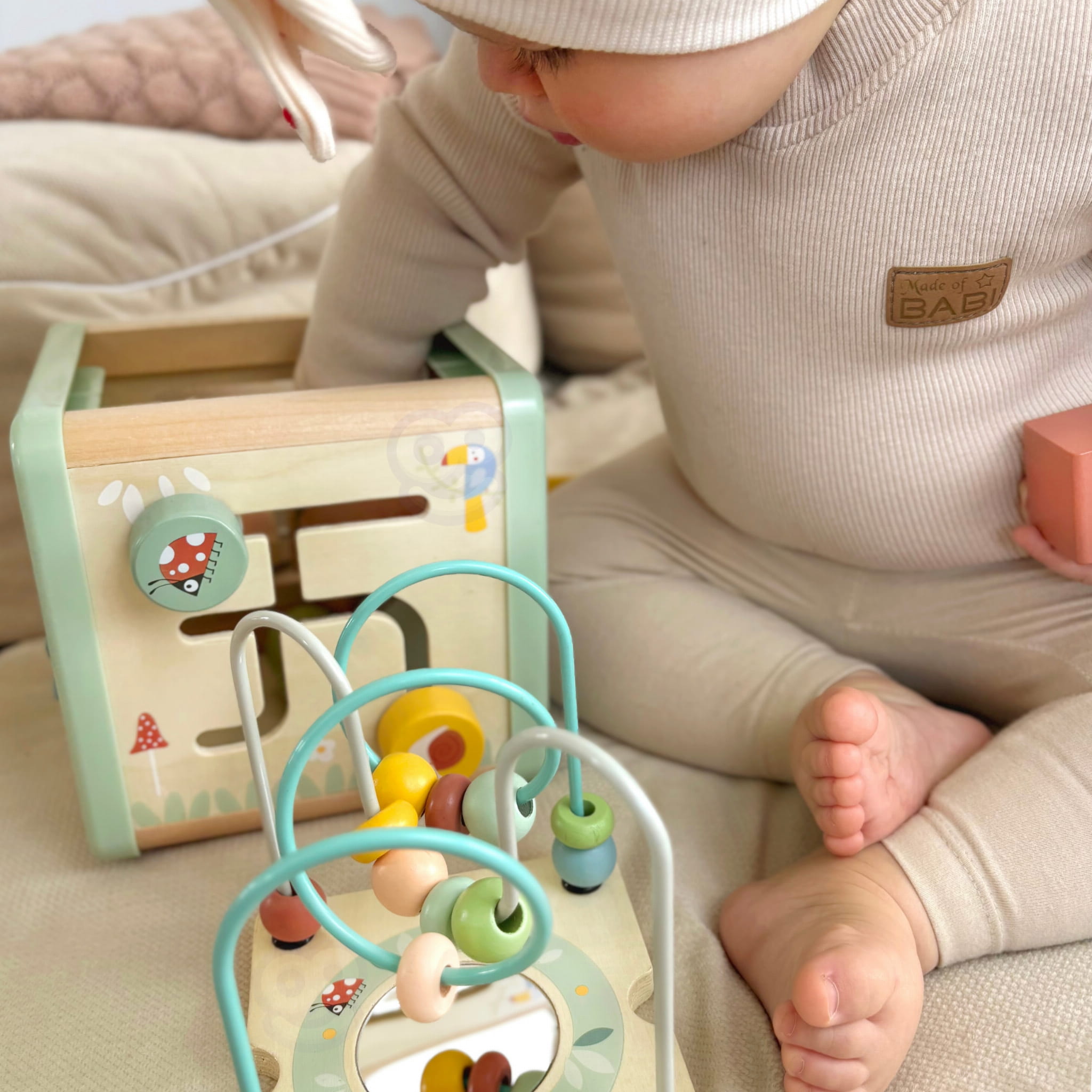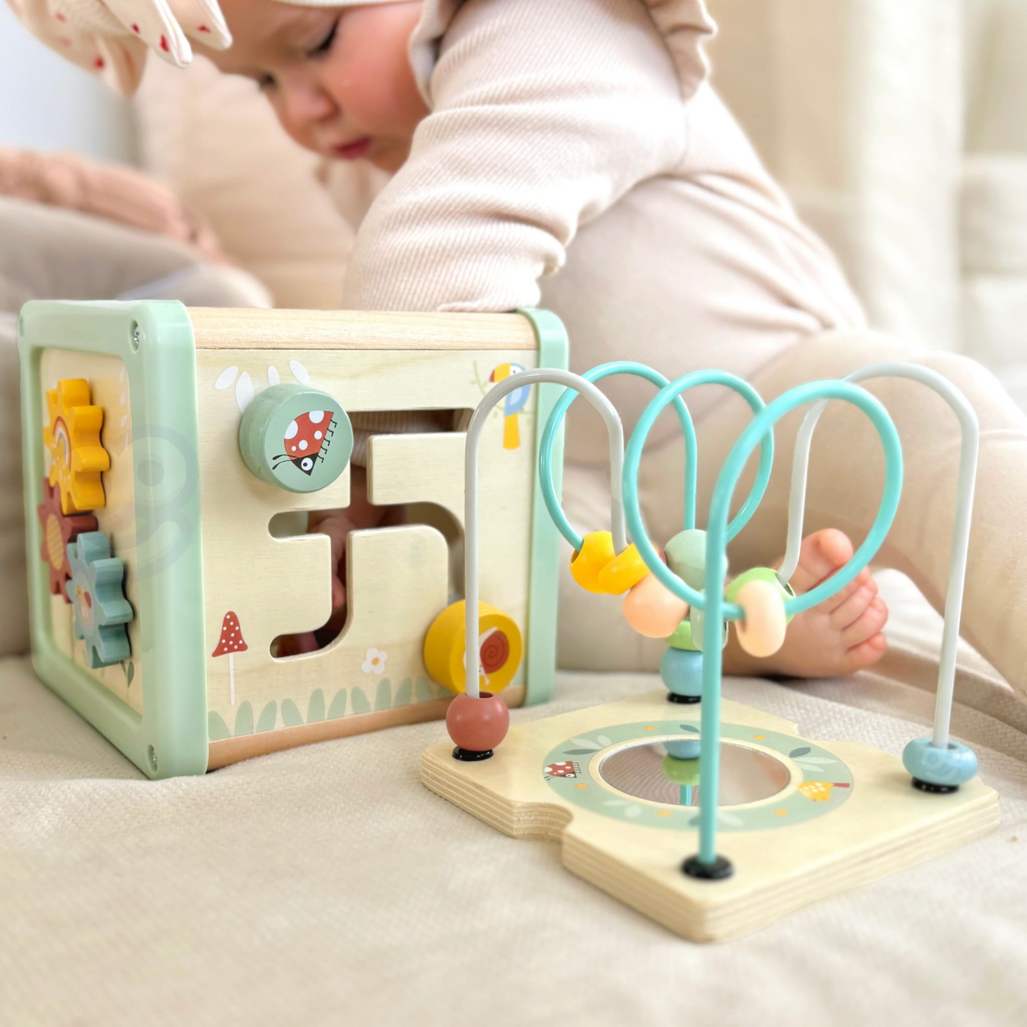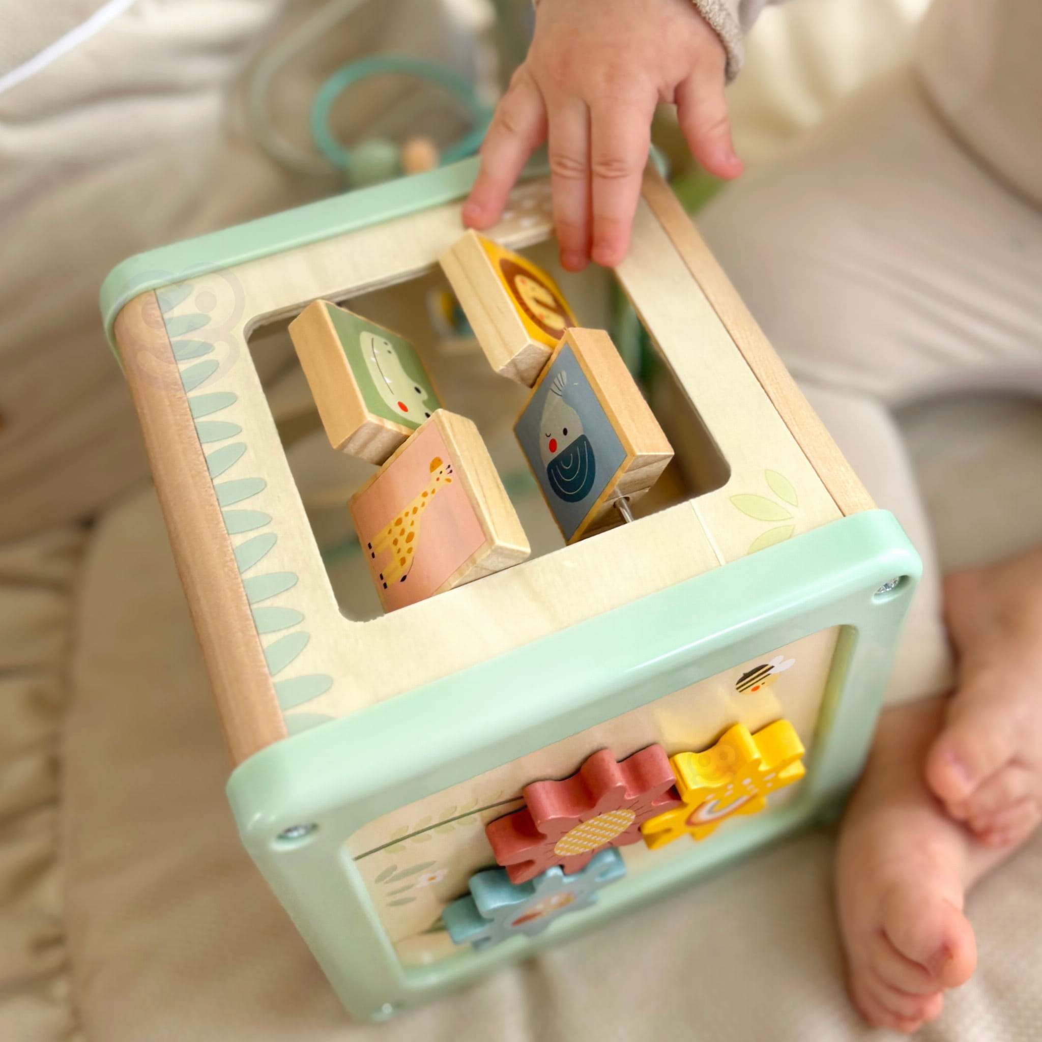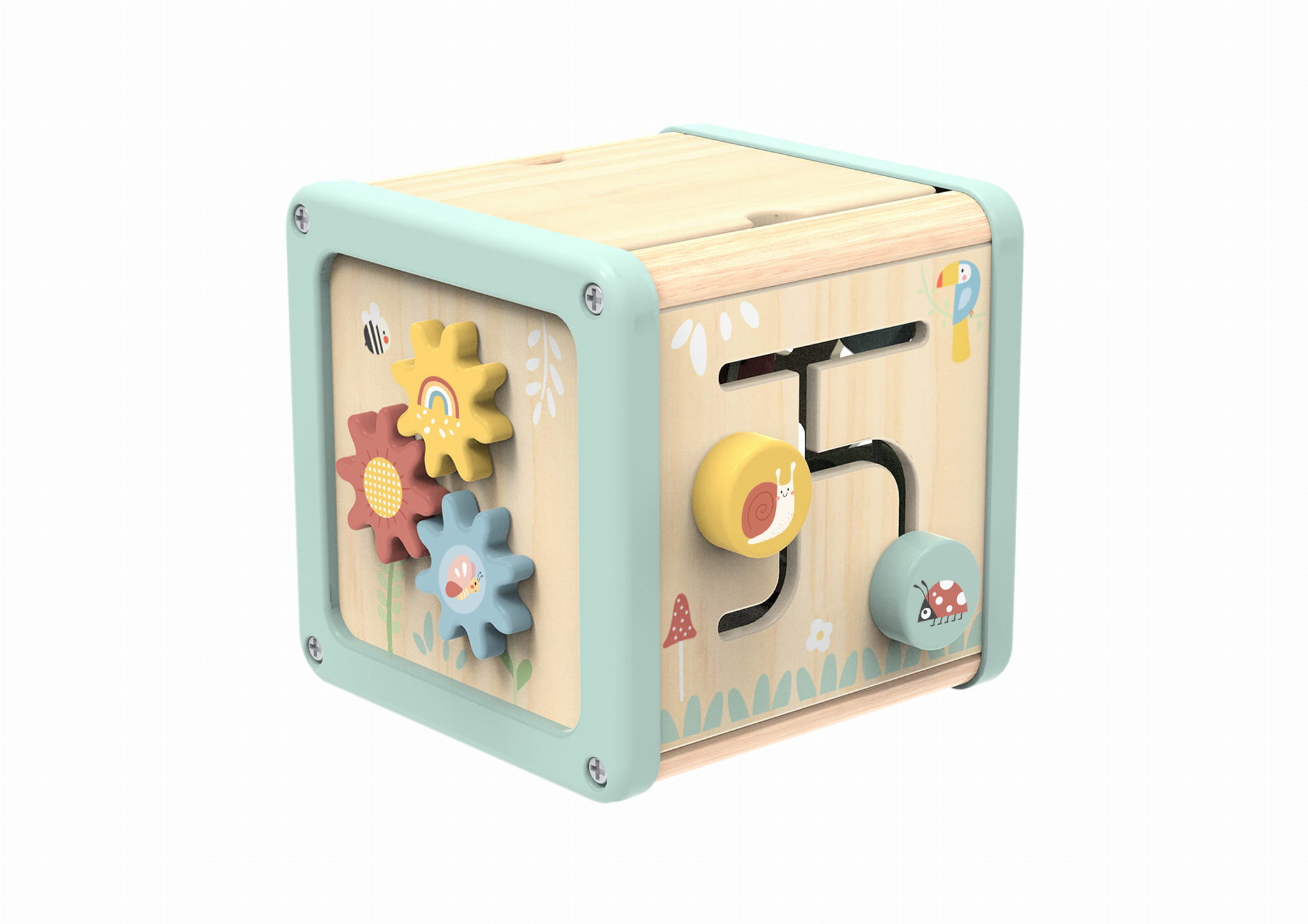 Edukacyjna WOOPIE GREEN Drewniana Kostka Aktywności Sorter – pastelowa kostka z panelami do manipulacji: zębatki, labirynt z koralikami, suwaki, sortowanie kształtów. Stworzona dla dzieci 18 m+, rozwija motorykę i logiczne myślenie!