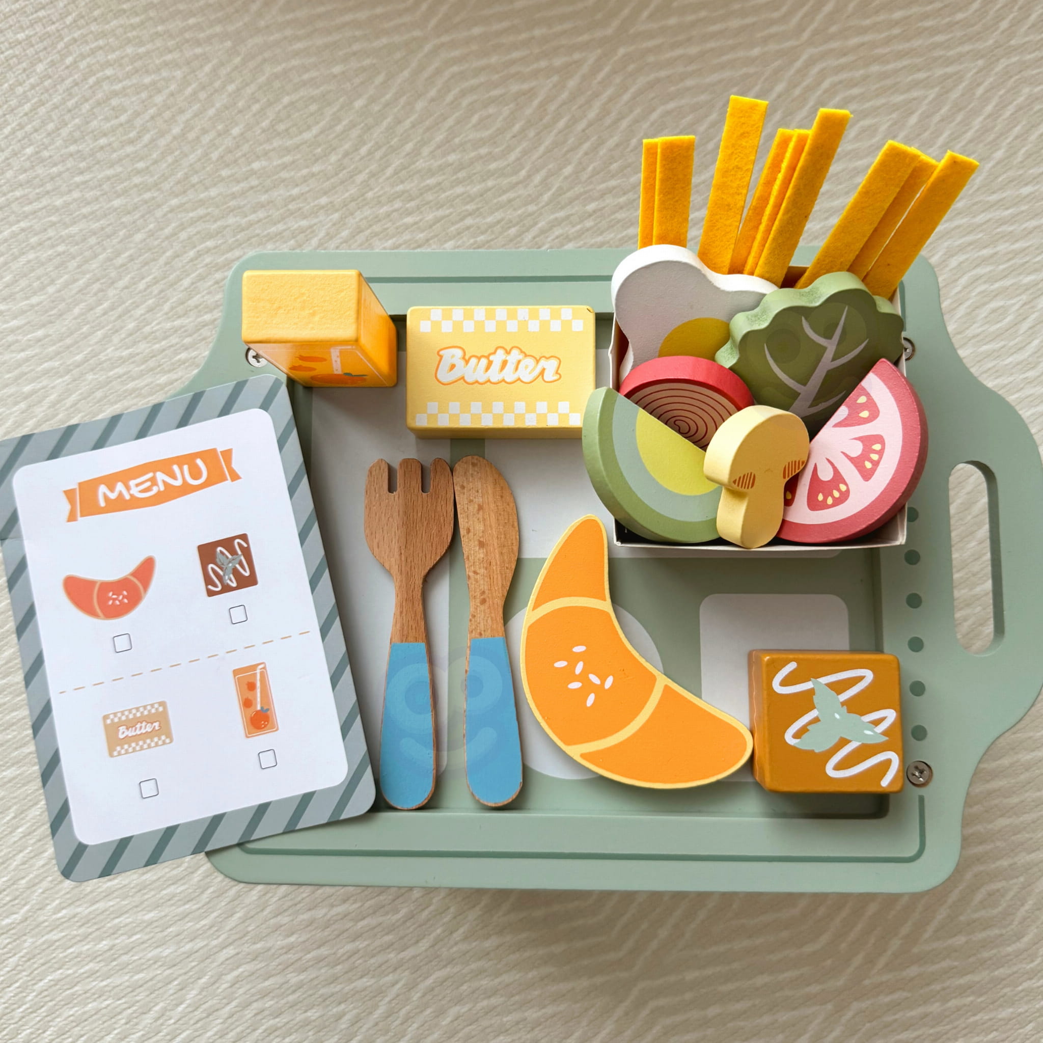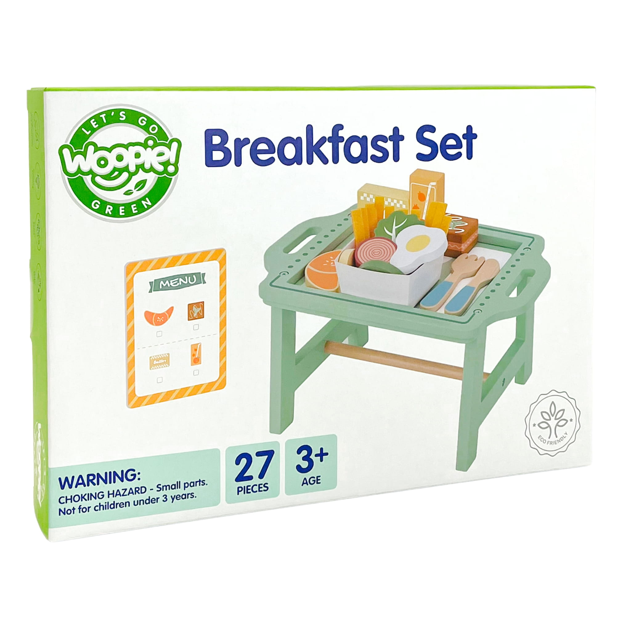 Pastelowy, drewniany zestaw WOOPIE GREEN Zestaw Śniadaniowy i Restauracja to 26 elementów – taca, potrawy, sztućce i menu. Idealny do zabawy w zamawianie i serwowanie pysznego śniadania!