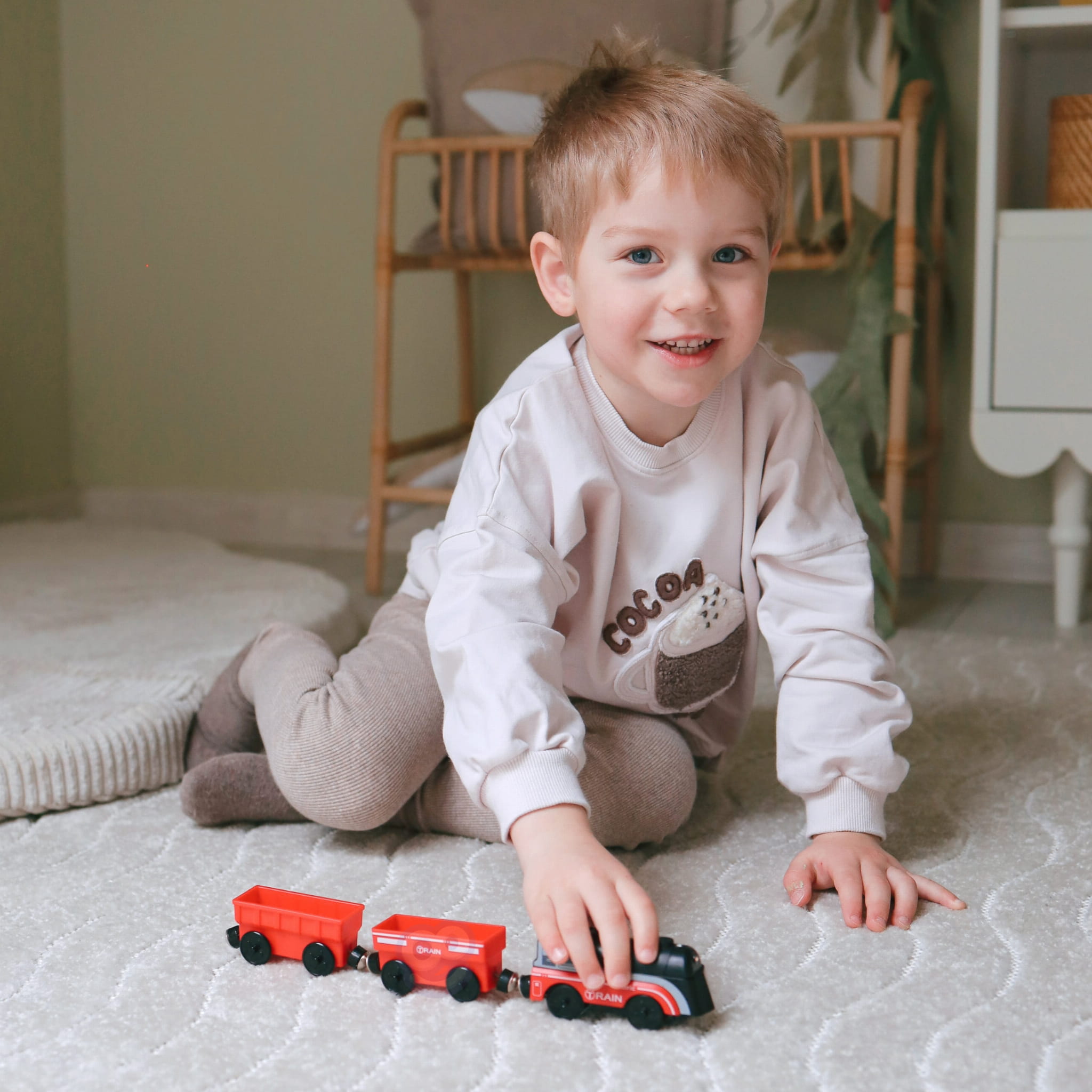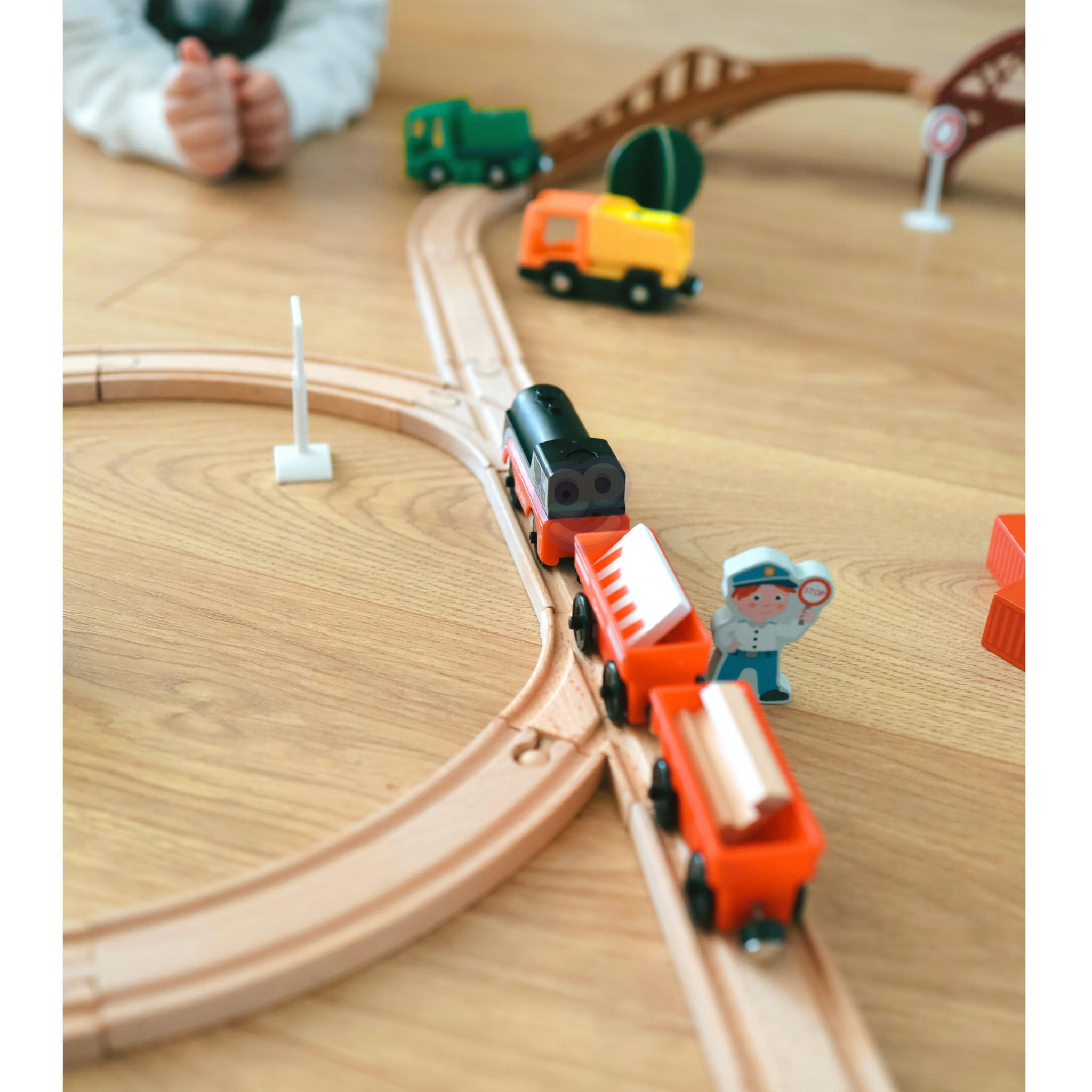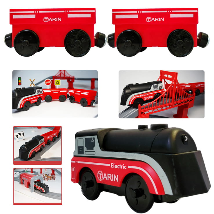 Elektryczna WOOPIE Lokomotywa z wagonami na magnes – idealna dla maluchów powyżej 3 lat. Jeździ na baterię, ma światło i jeździ po drewnianych torach. Rozwija motorykę, kreatywność i koordynację.