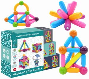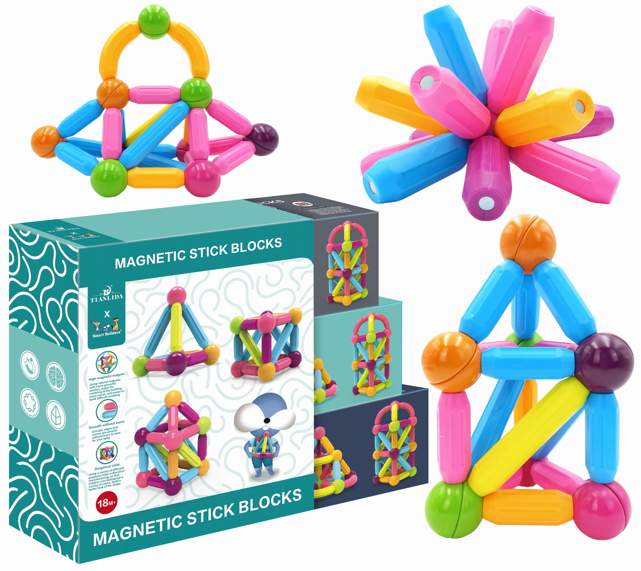 Zestaw WOOPIE Magnetyczne Klocki Konstrukcyjne Edukacyjne Duże Grube 38 el. dostarcza dziecku metalowe kulki oraz patyczki (łuki, krótkie i długie) w grubych, kolorowych formach, które bezpiecznie łączą się magnetycznie, umożliwiając tworzenie konstrukcji takich jak domki, figury geometryczne i abstrakcje; zabawa rozwija wyobraźnię przestrzenną, małą motorykę, kreatywność i koncentrację, a zestaw zapakowany jest w wygodną skrzyneczkę idealną na prezent – rekomendowany dla dzieci już od 18 miesiąca, szczególnie tych lubiących budować i eksperymentować.
