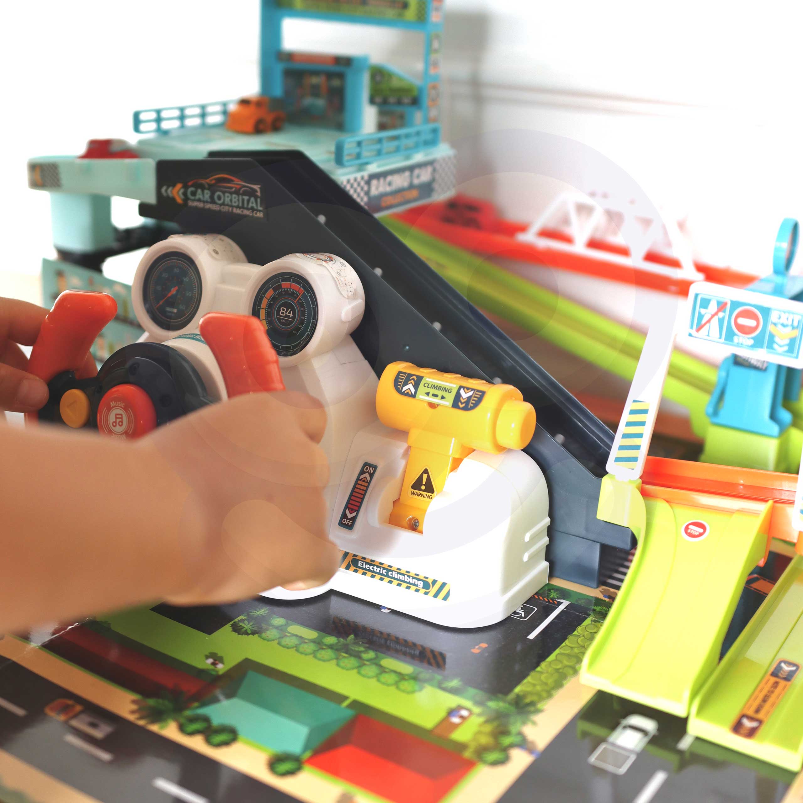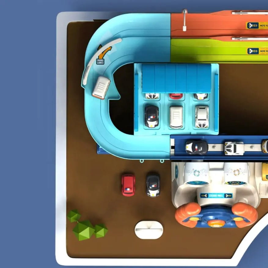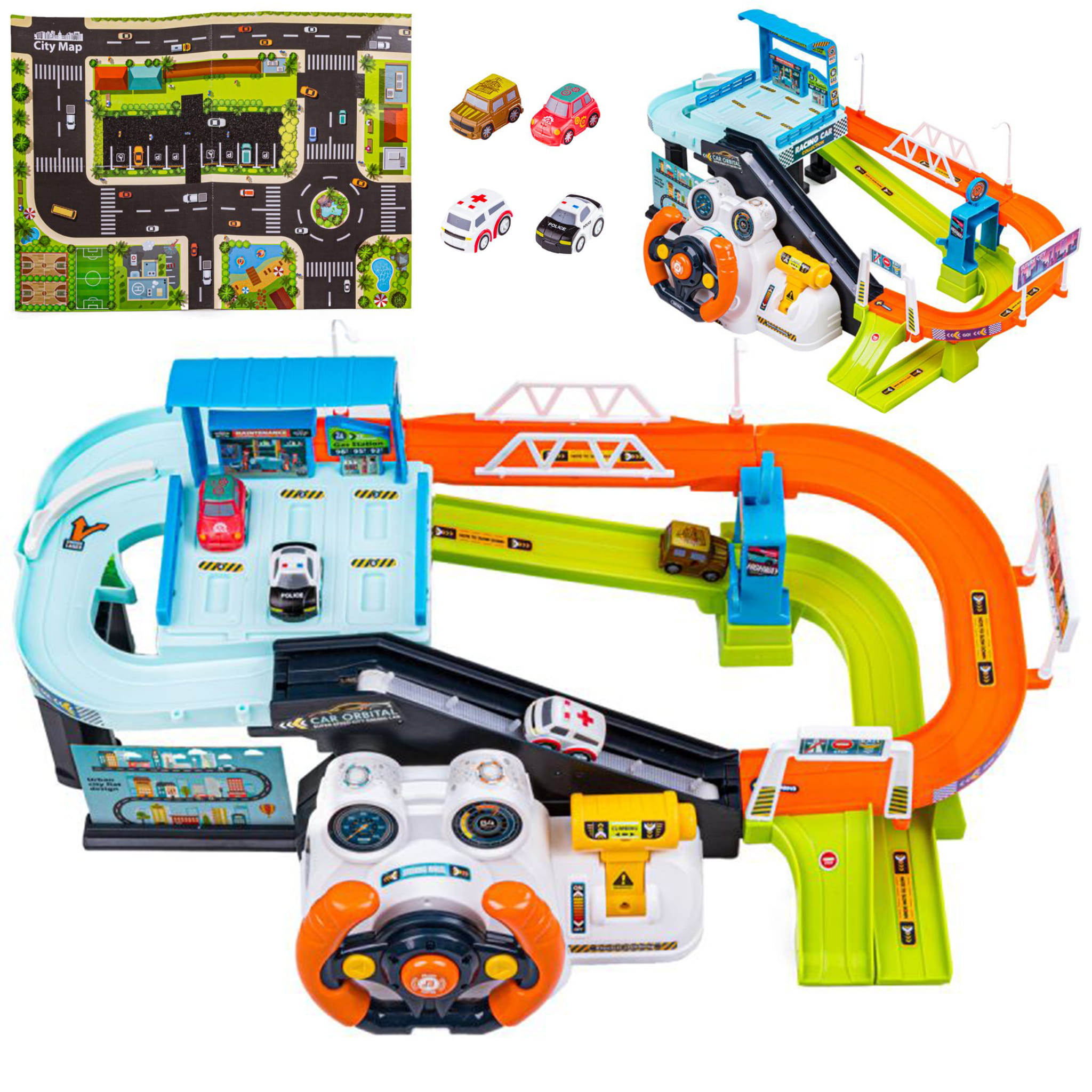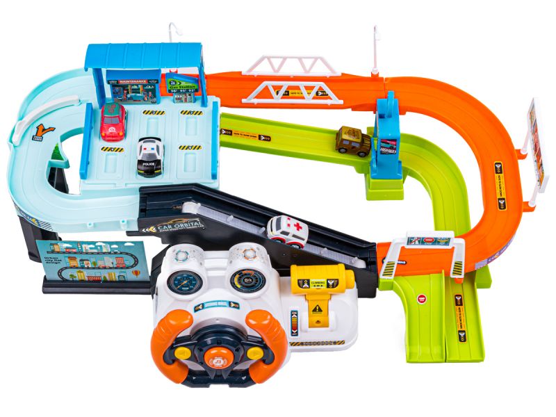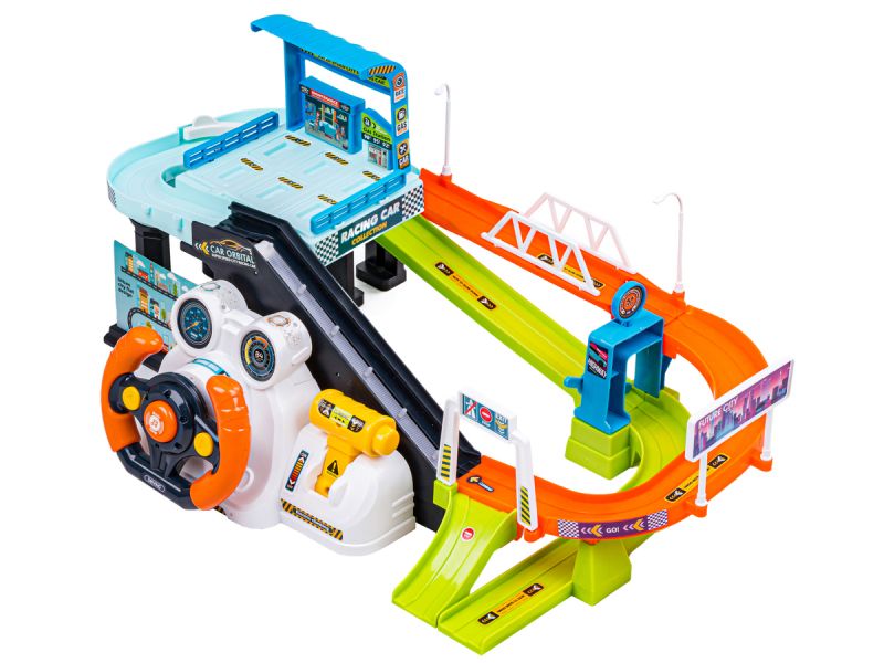 Wielopoziomowy tor z garażem, spiralnymi zjazdami i szlabanem – można zmieniać kierunek jazdy,