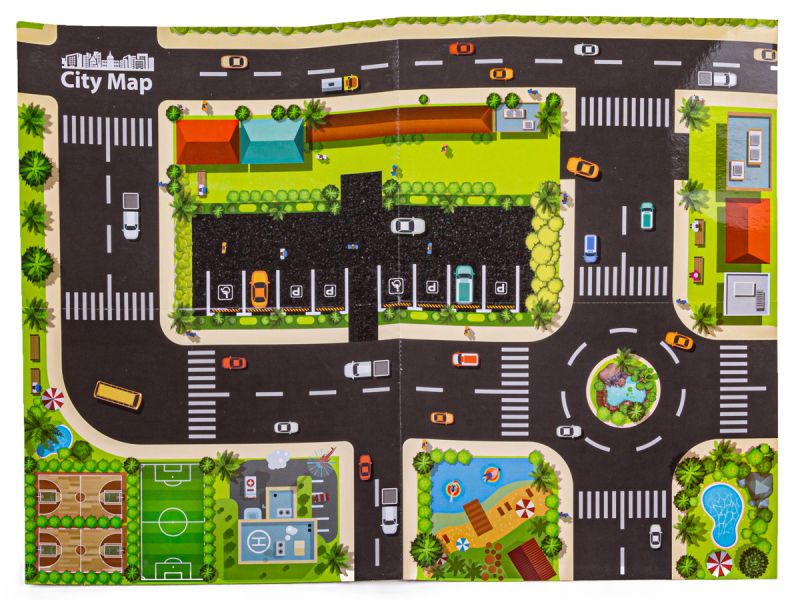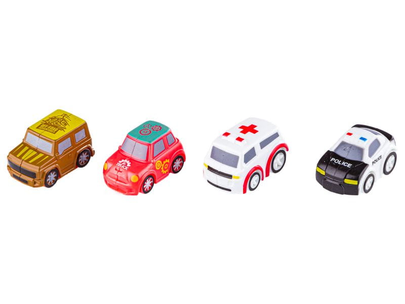 4 kolorowe auto, których jazda kończy się na dołączonej macie parkingowej.