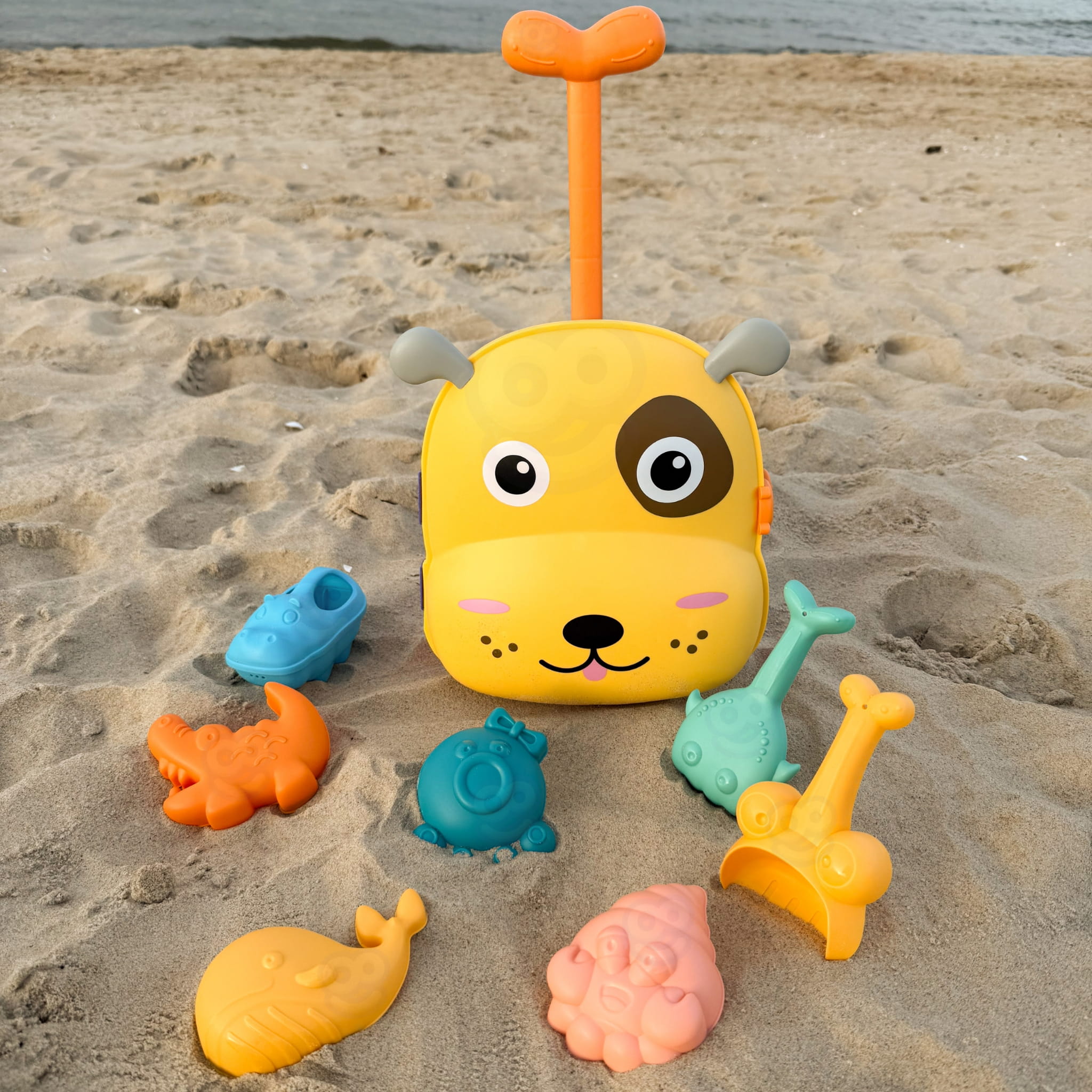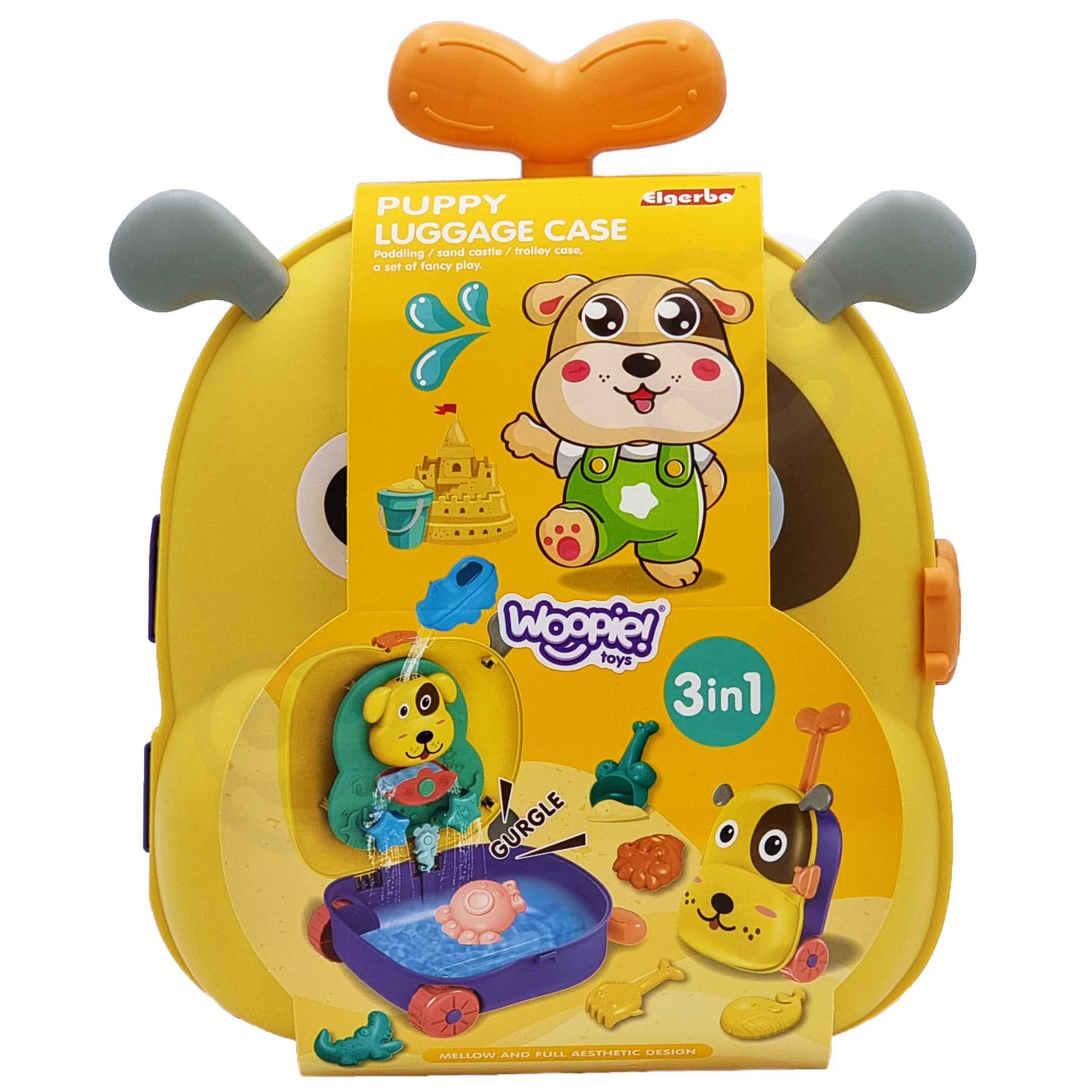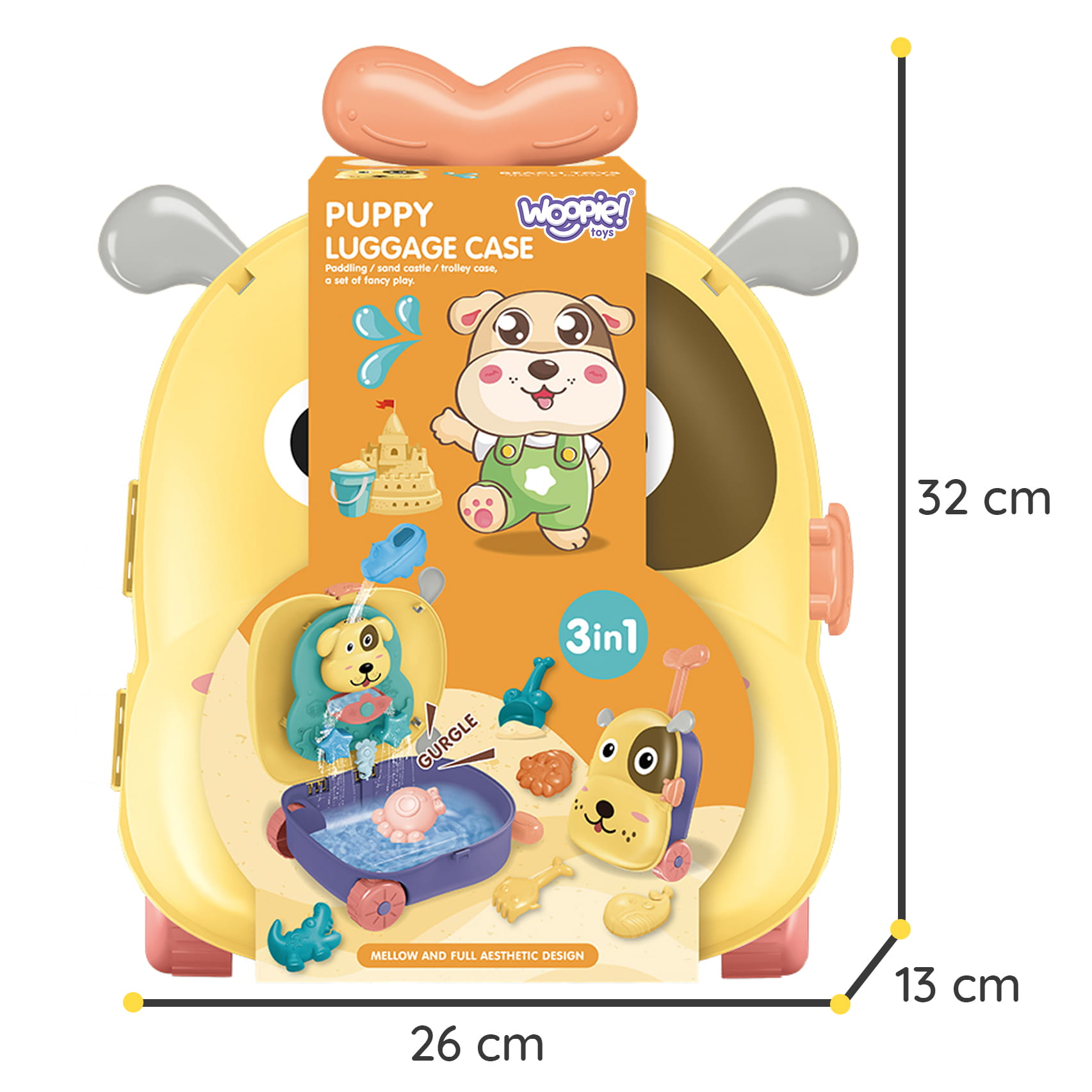 WOOPIE Zestaw do Piasku 3w1 w formie walizki z motywem pieska (lub innych zwierzaków) to wszechstronną zabawkę dla dzieci od 3 lat – wystarczy napełnić jej dno wodą, a specjalny kubeczek pozwala na polewanie "głowy" pieska, co tworzy wodną atrakcję; w środku znajduje się także komplet do zabawy w piasku: grabki, dwie łopatki, cztery foremki i kubeczek, a zamknięta walizka z rączką i cichymi kółkami z łatwością towarzyszy dzieciom w podróży, do ogrodu czy nad morze; zestaw dostarcza stymulacji sensorycznej, rozwija kreatywność i małą motorykę, a dzięki wymiarom 26 × 13 × 47 cm i wadze ok. 0,6 kg jest lekki, przenośny i gotowy do zabawy w wodzie i piasku.