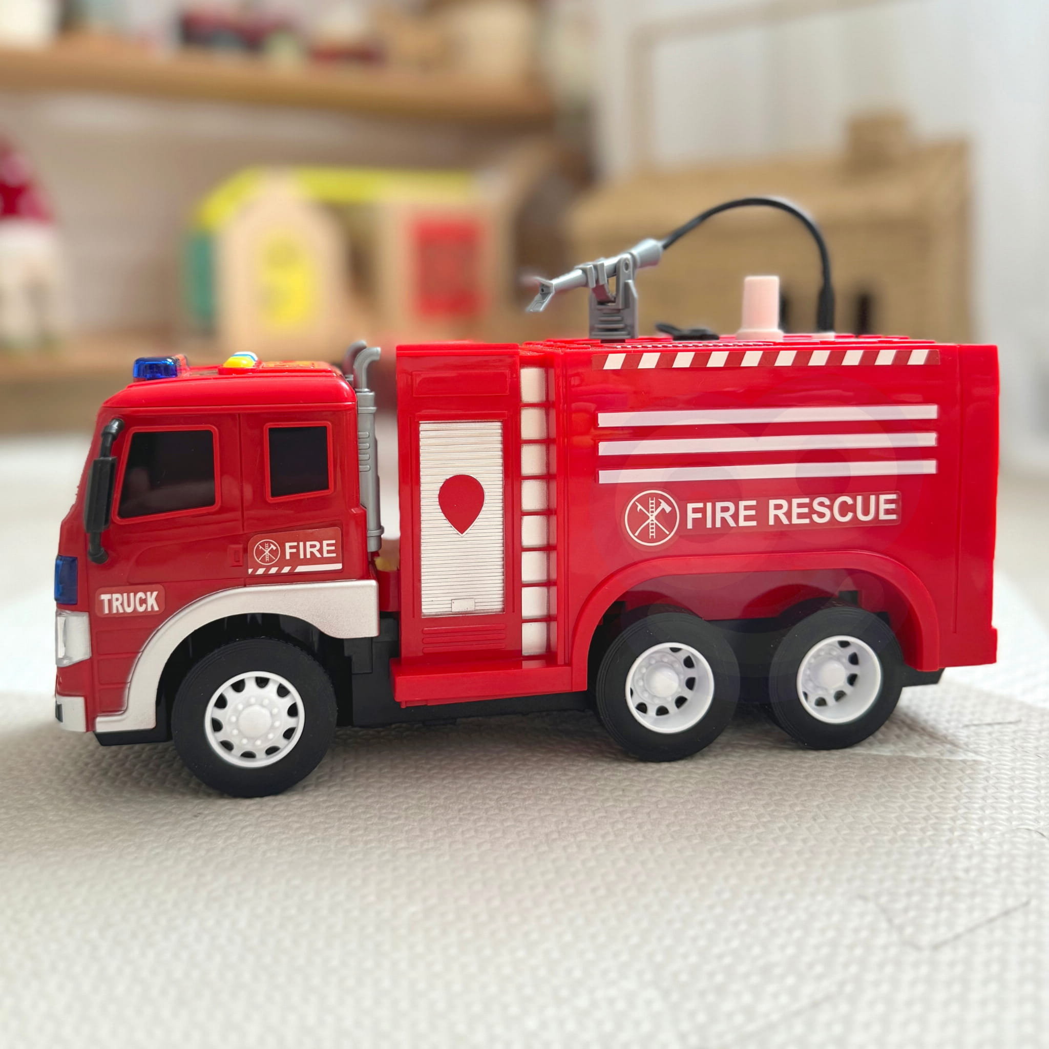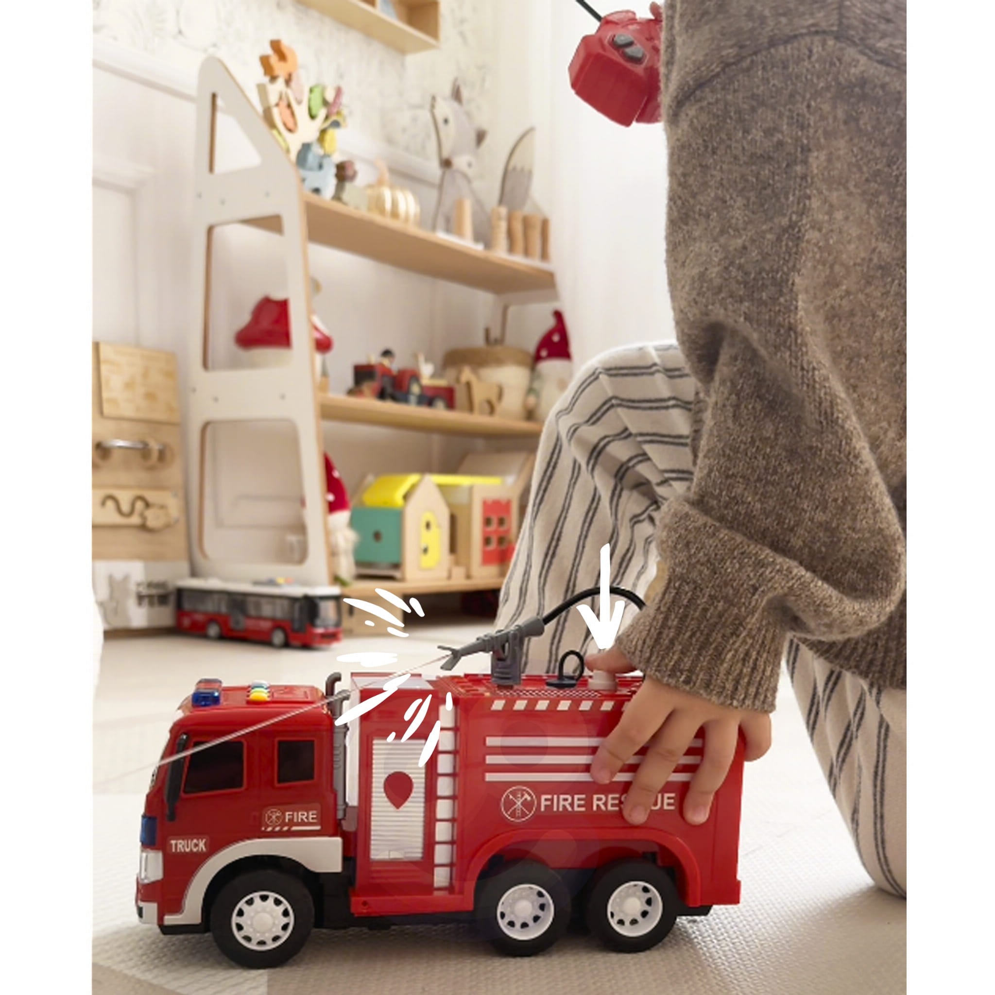 - Funkcja lania wody - dzięki specjalnemu zbiornikowi, do którego można nalać wodę, wóz umożliwia "gaszenie pożarów" pompka po naciśnięciu umożliwia uruchomienie strumienia wody, co dodaje zabawie realizmu.